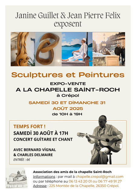 Retrouvez les merveilleuses sculptures bois ou pierre de Janine Guillet les 30 et 31 août dans le cadre d'une exposition organisée par L'association des amis de la Chapelle St Roch à Crépol !